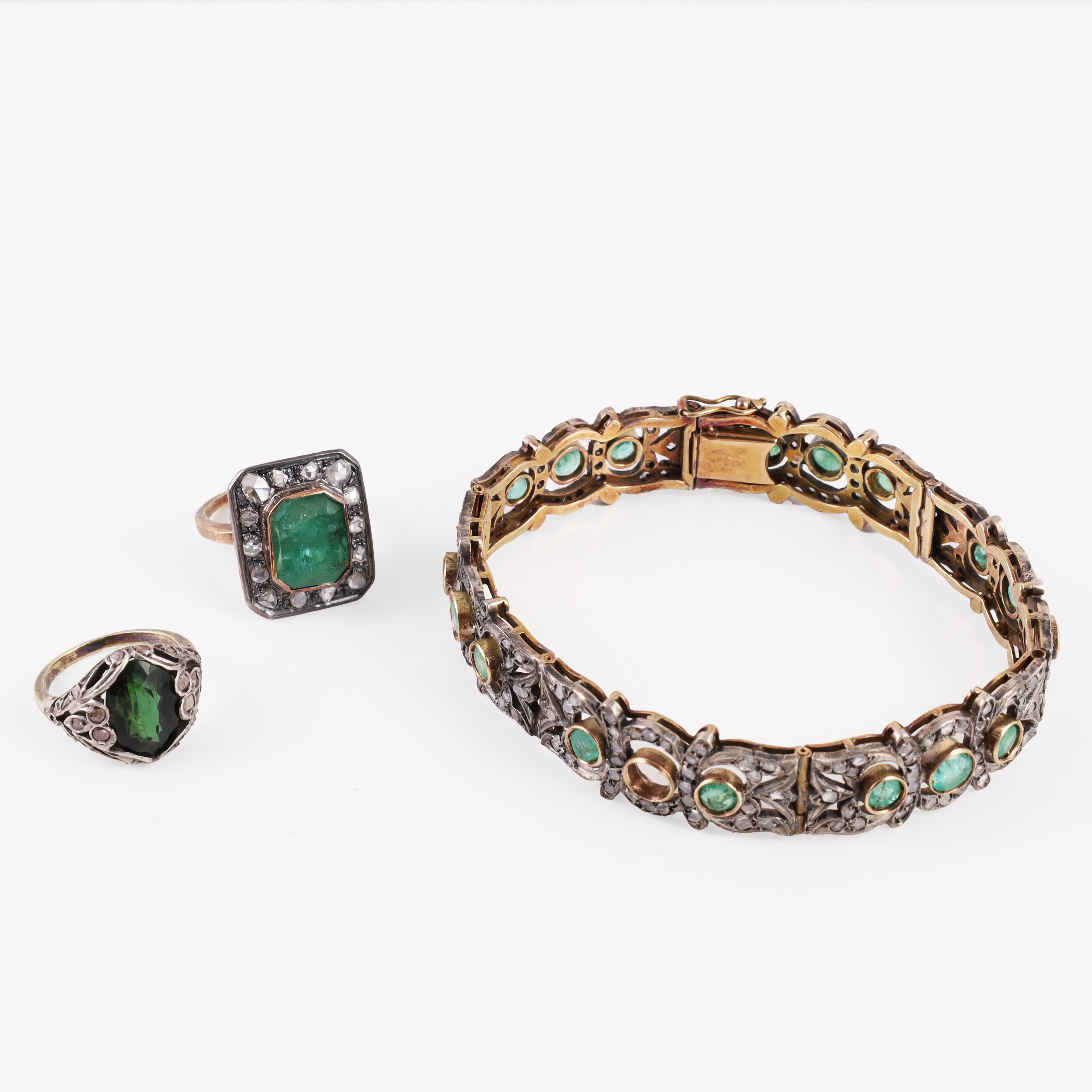 in oro e argento, composto da un bracciale a nastro traforato con smeraldi (uno mancante), un anello con smeraldo contornato da diamanti taglio a rosa e un anello con tormalina e diamanti taglio a rosa (mancanze), gr. complessivi 46.