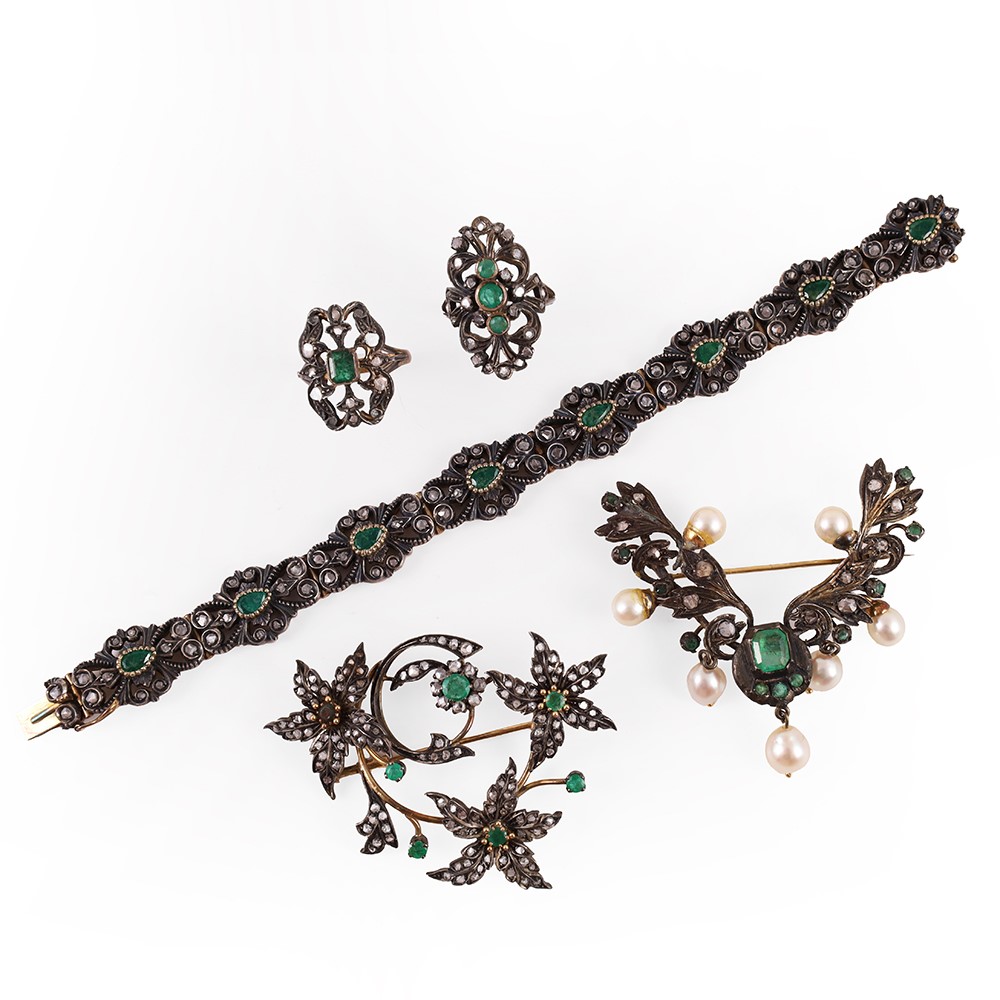 in oro e argento, composto da un bracciale, due spille a ramage e due anelli, ornati da diamanti taglio a rosa, smeraldi e perle coltivate, gr. complessivi 86.