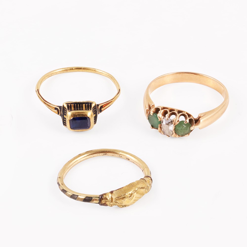 composto da tre anelli in oro giallo con smeraldi, diamante, zaffiro e smalto; uno con materiale non aurifero all'interno del gambo, gr. complessivi 5,9.