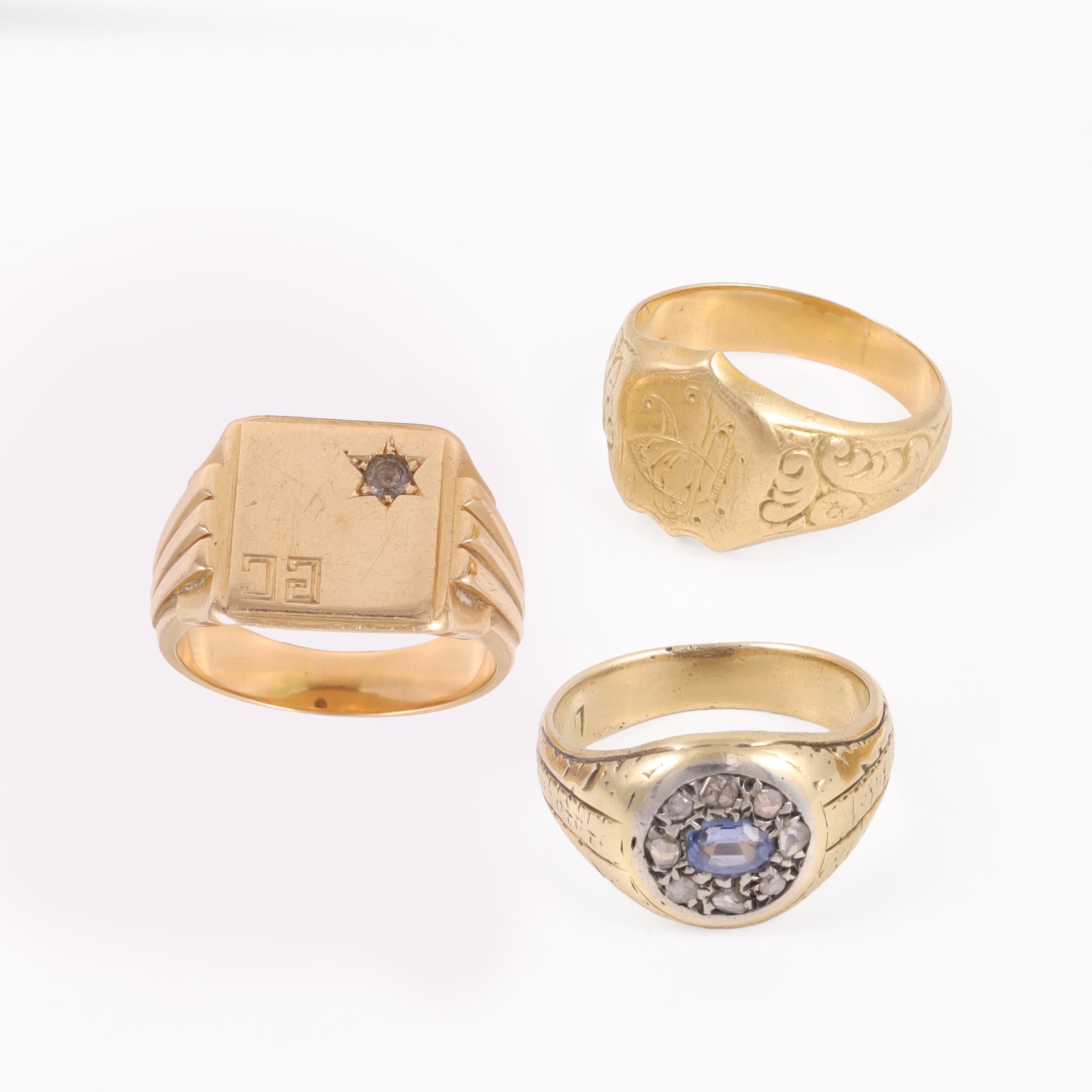 composto da un anello in oro e argento con zaffiro e diamanti taglio a rosa e due anelli in oro giallo di cui uno con pietra sintetica, gr. complessivi 48,3.