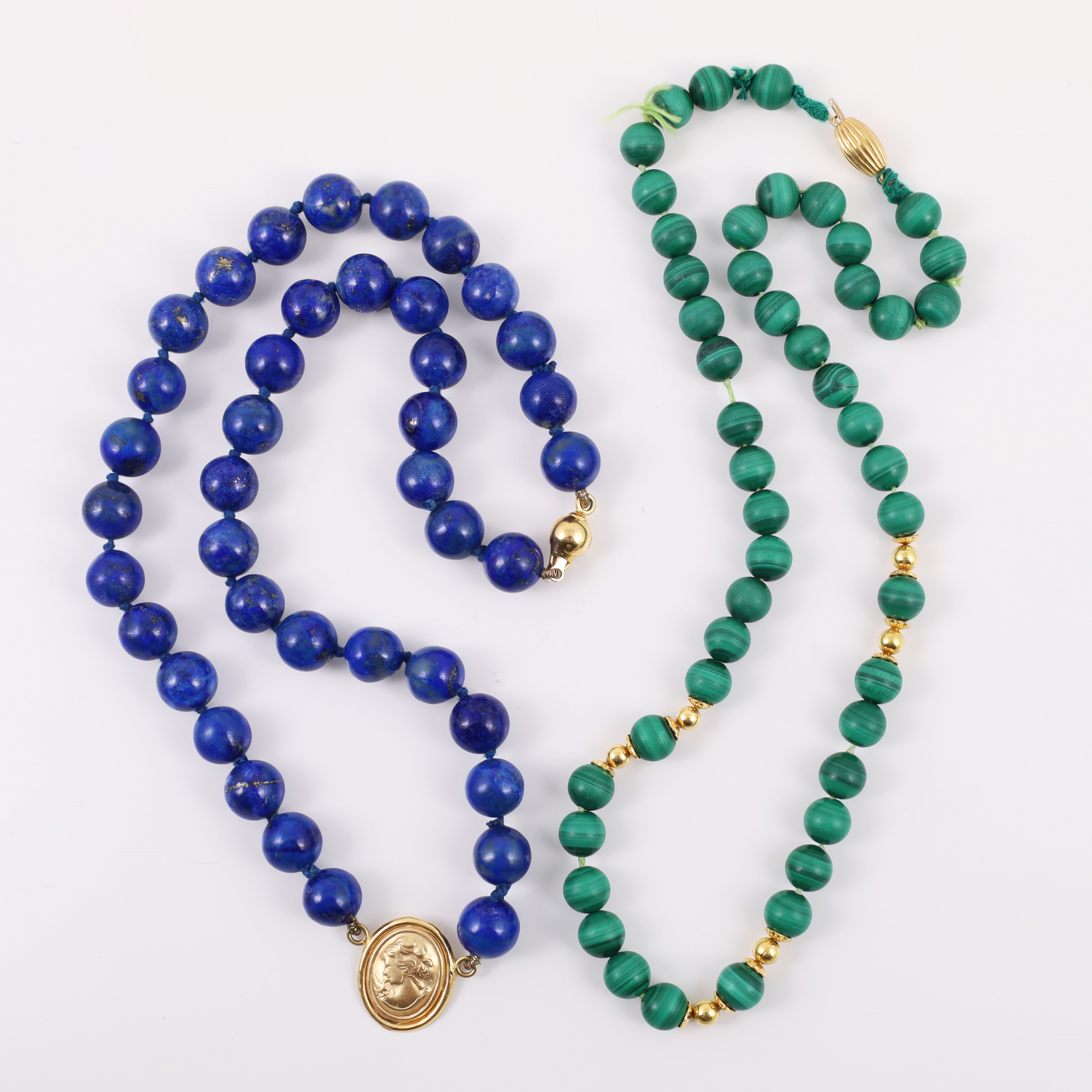 composto da due collane con sfere di lapislazzuli e malachite, chiusure ed elementi in oro giallo.