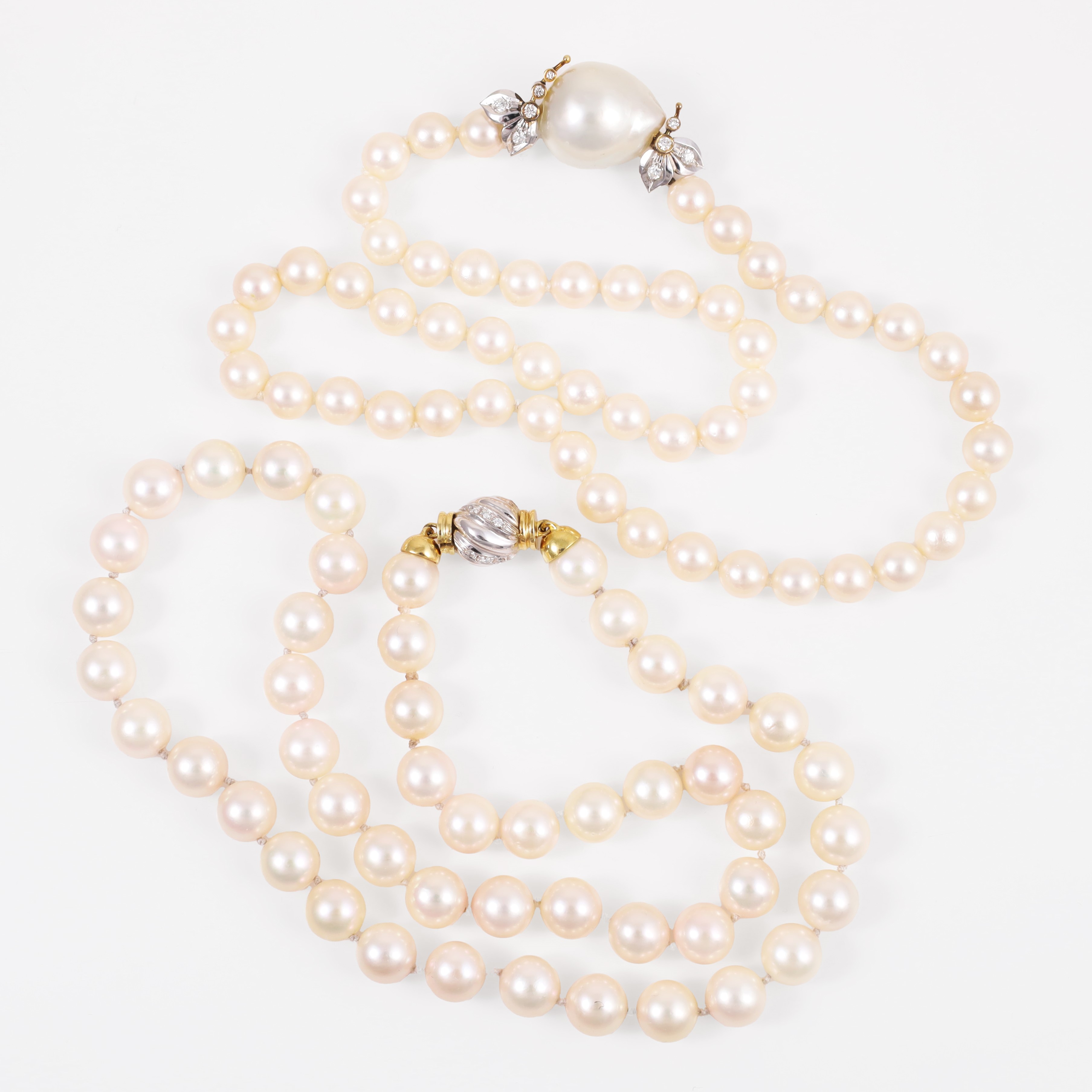 composto da due collane a un filo di perle coltivate 8,5 mm e 7 mm ca., con fermezze in oro giallo e bianco con piccoli brillanti.