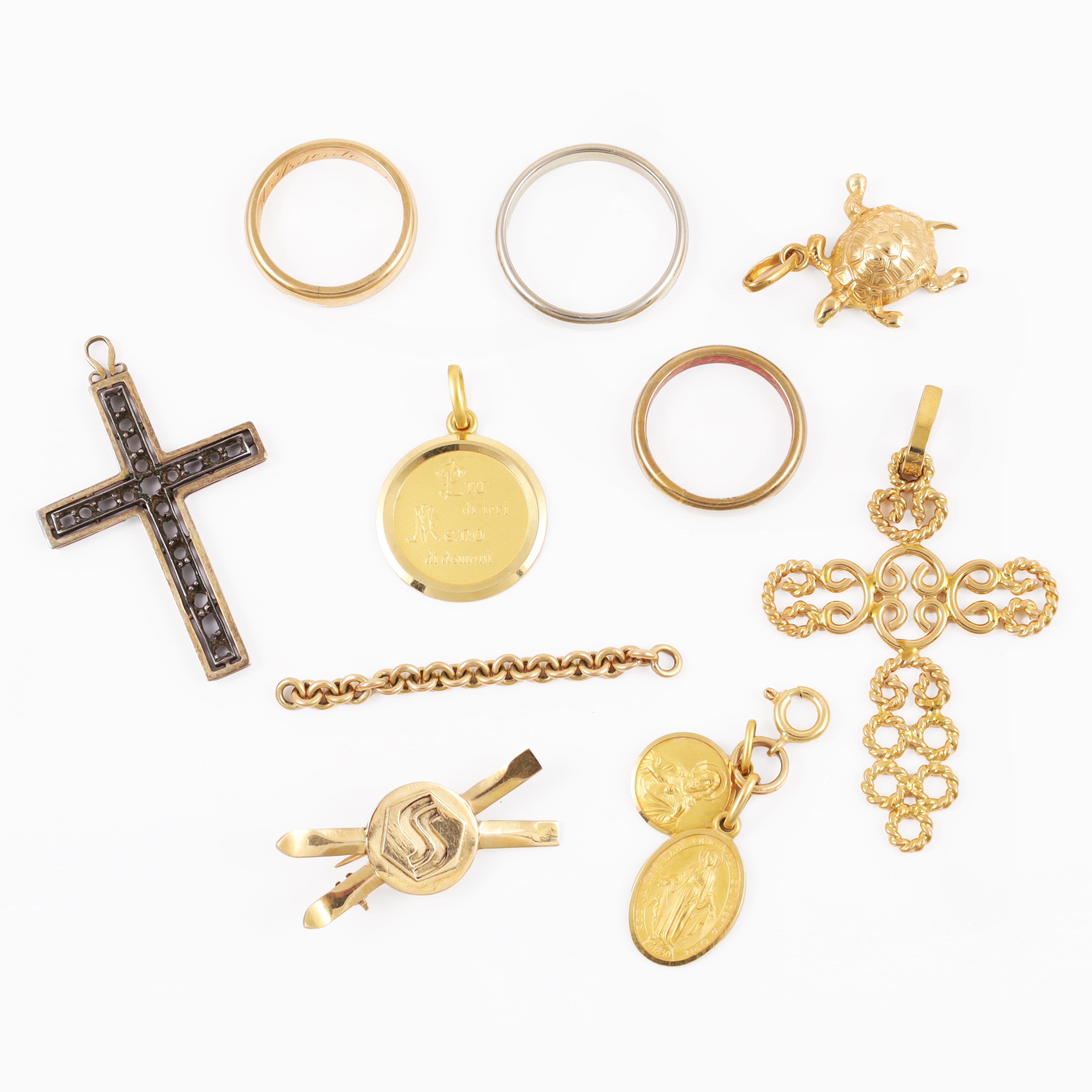 composto da tre fedi, un pendente a croce, un ciondolo a forma di tartaruga, tre medaglie, una spilla e un segmento di catenella, in oro gr. complessivi 37,2. e un pendente a croce in oro e argento privo di gemme, gr. 2,9.