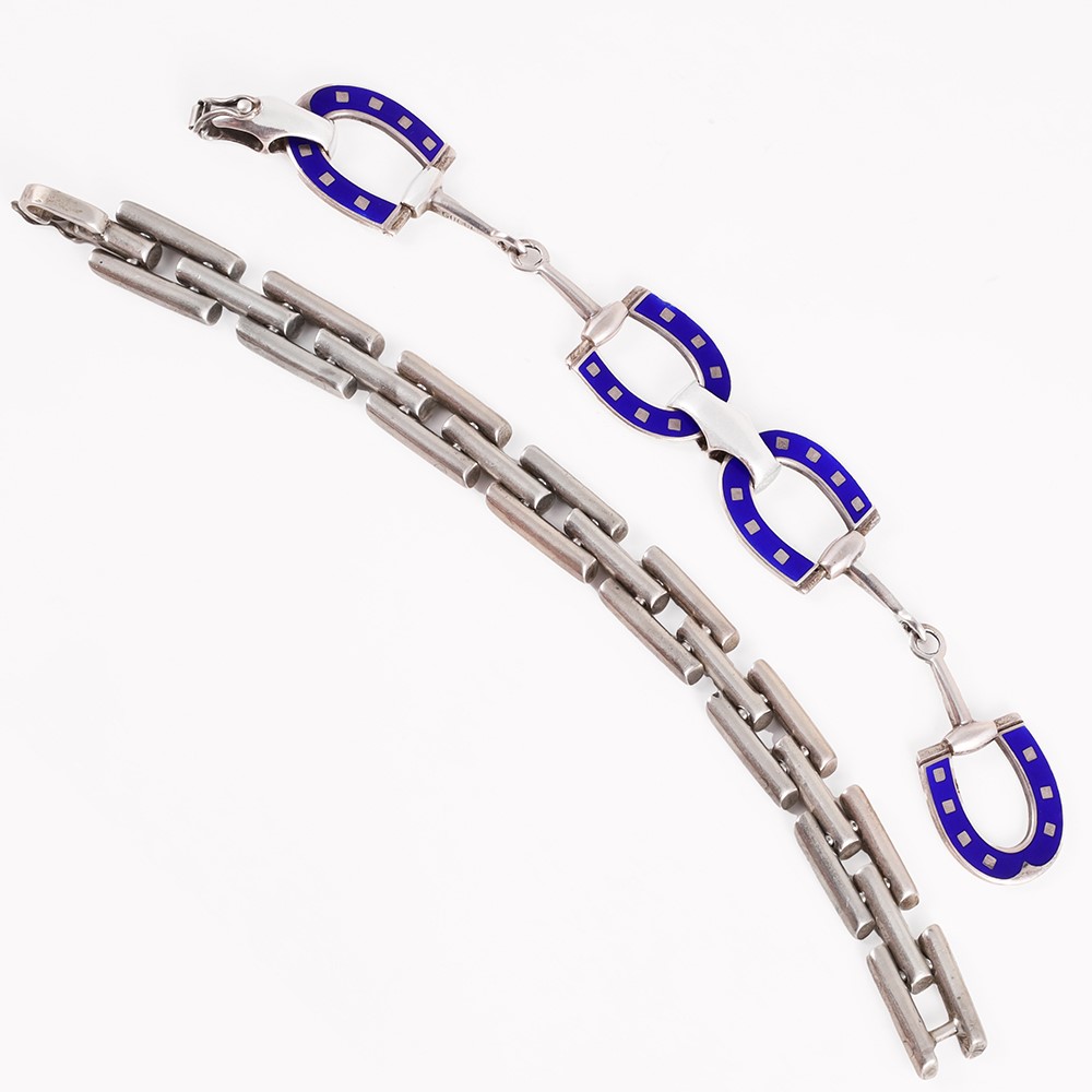 composto da due bracciali in argento 925/1000, rispettivamente d'ispirazione equestre con smalto blu (fêlure) e a maglie geometriche, gr. complessivi 133.