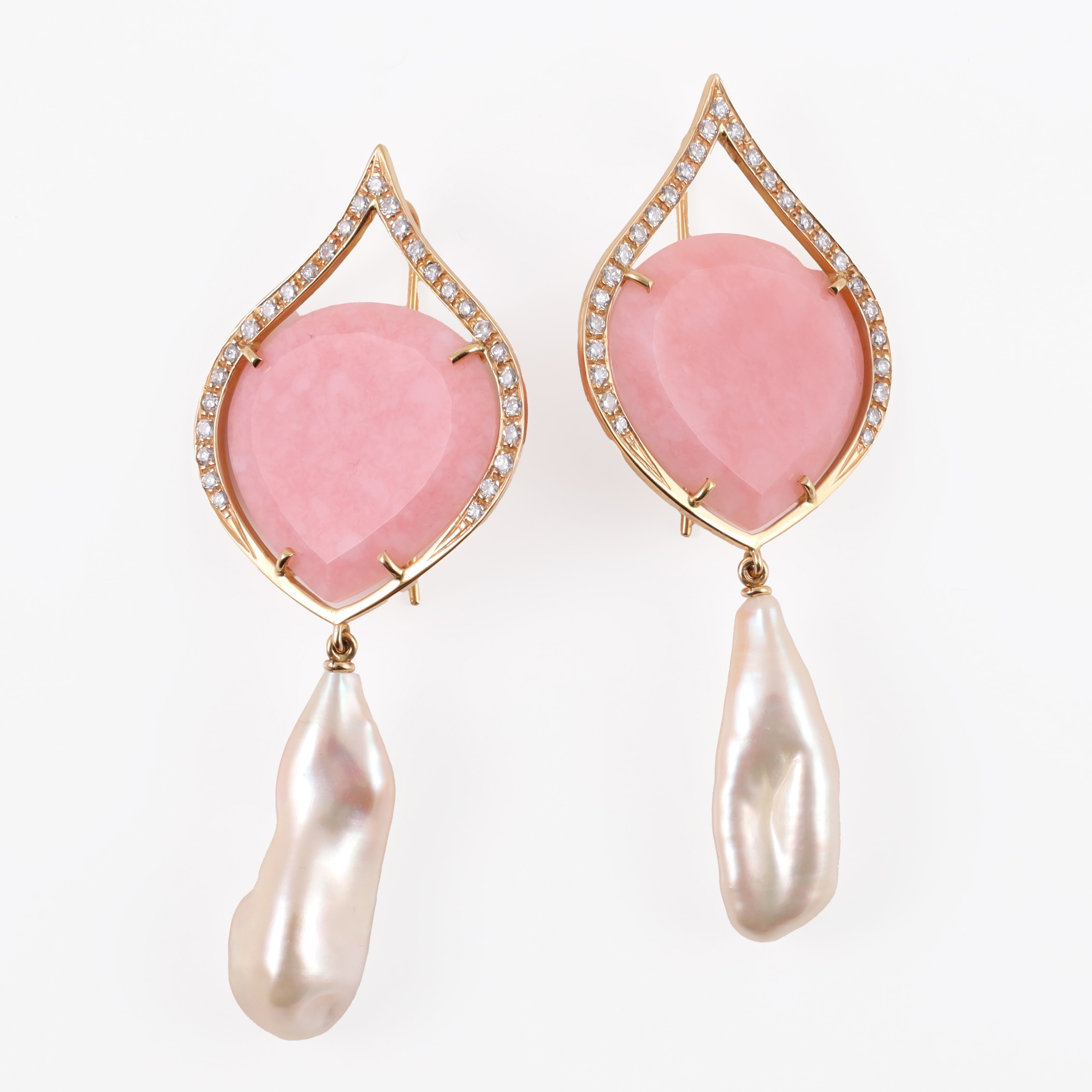 pendenti in oro rosa con motivo a goccia profilato da brillanti, lastra di opale rosa sfaccettata e perle d'acqua dolce terminali, gr. 17.