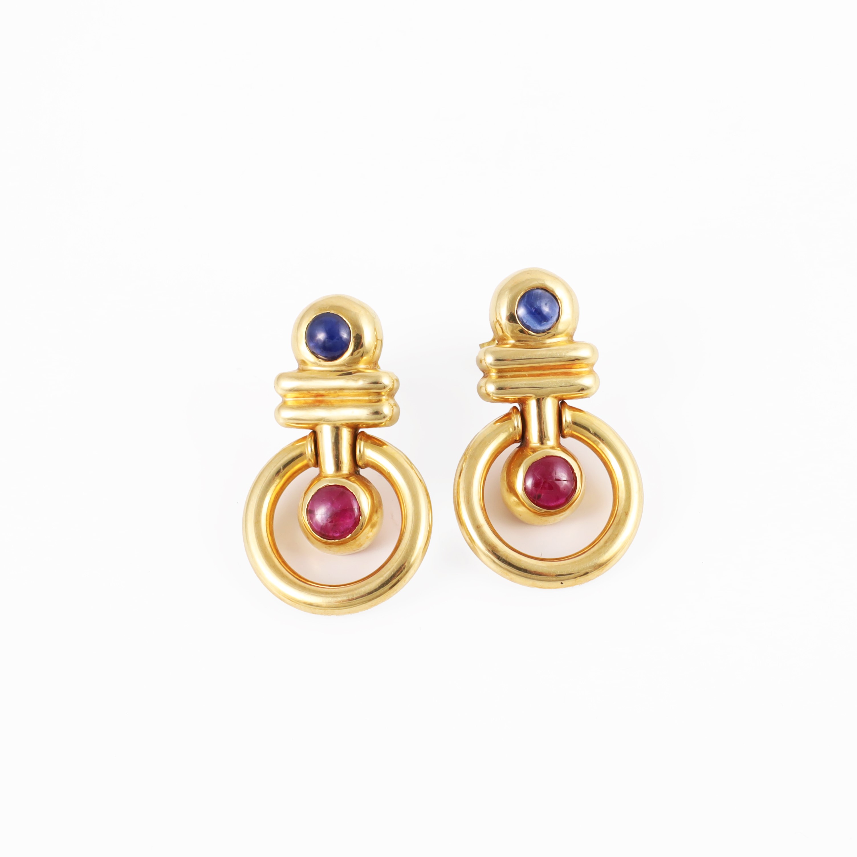 in oro giallo con pendenti a cerchio, impreziositi da zaffiri e rubini taglio cabochon, gr. 11.