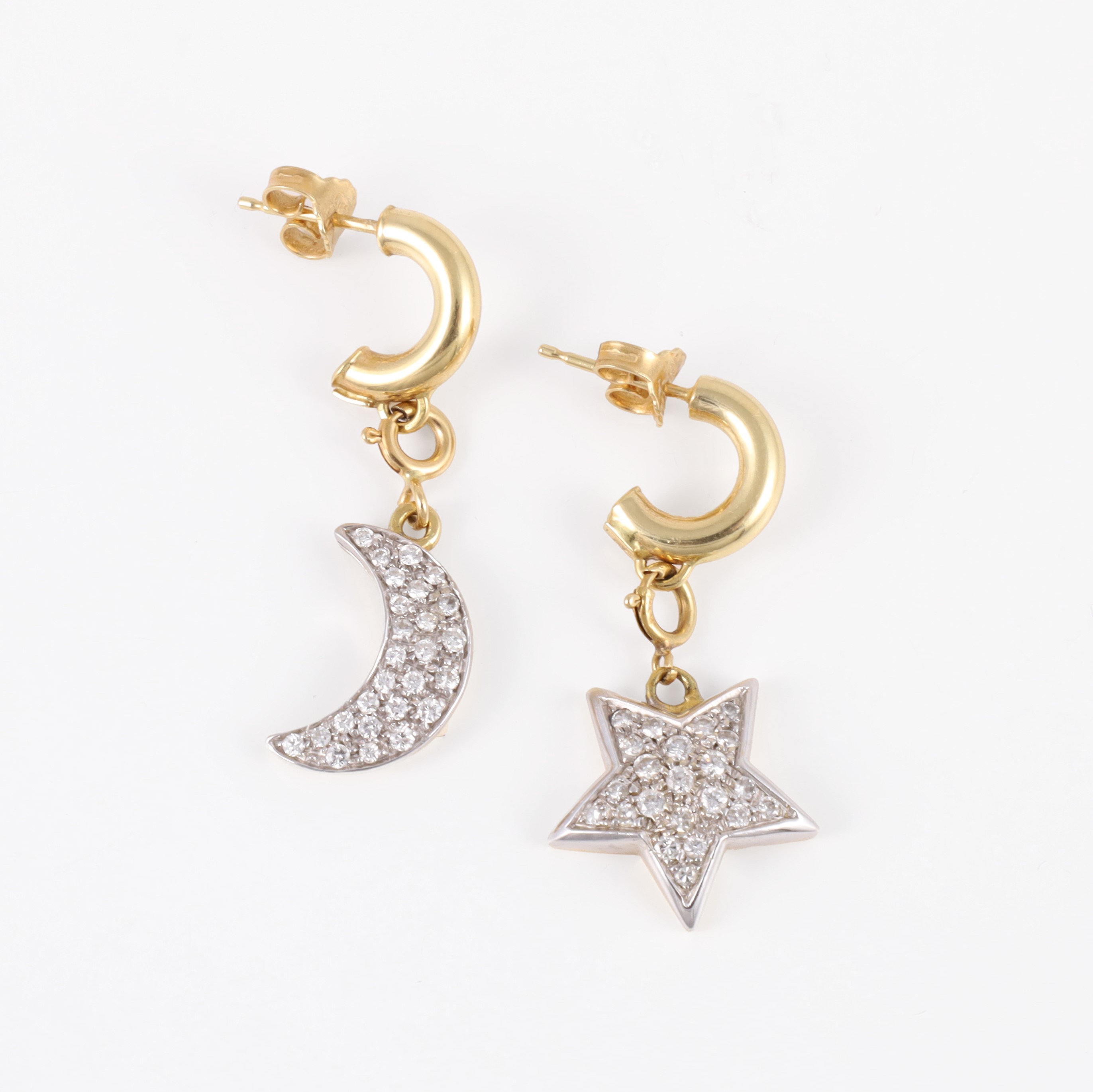 in oro giallo a semicerchio con pendenti staccabili in oro giallo e bianco a forma di stella e semiluna in pavé di brillanti, gr. complessivi 6,5.