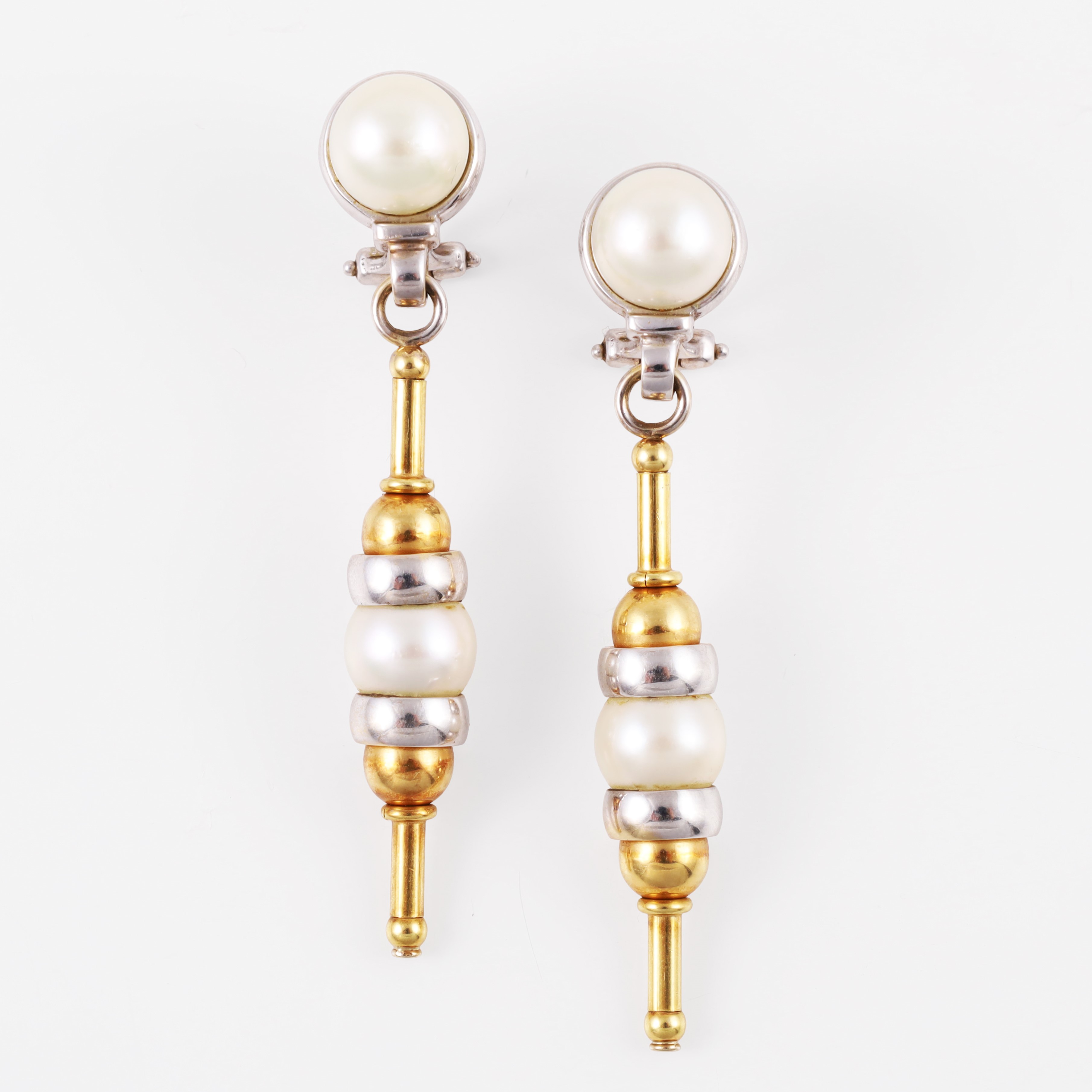 pendenti in oro giallo e bianco, a forma di fuso con perle coltivate, gr. 21,9.