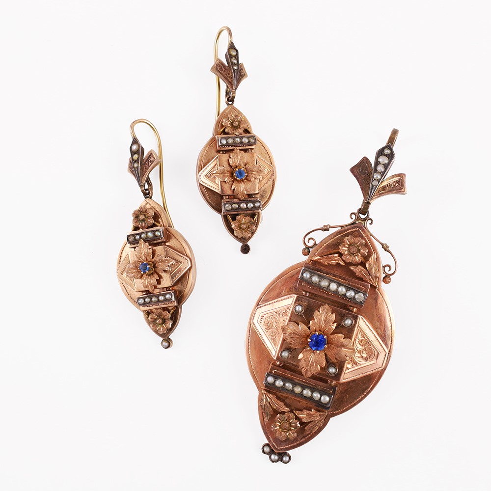 composta da pendente doppio uso spilla e orecchini a forma di losanga lobata, in oro 9KT con piccole perle e pietre sintetiche blu, gr. complessivi 21,3.