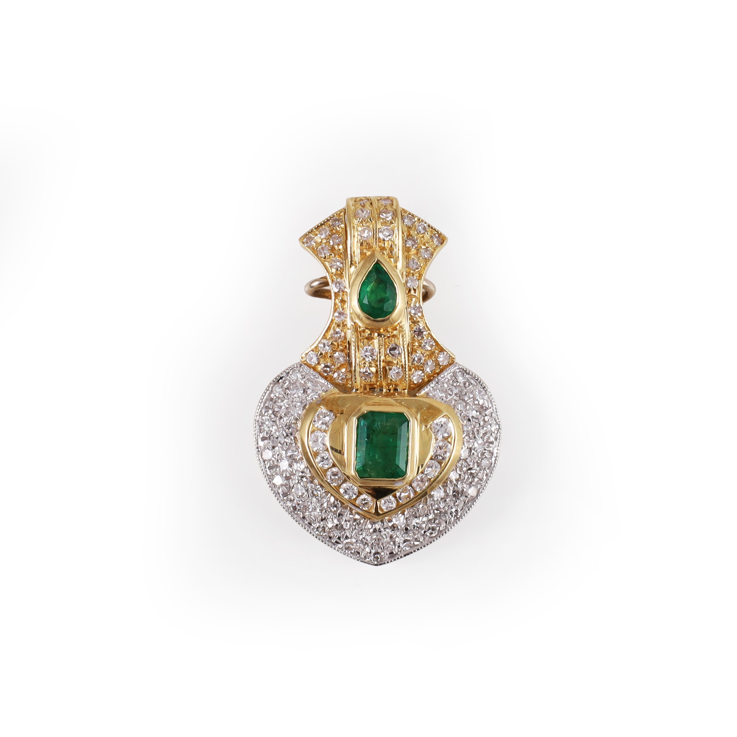 in oro giallo e bianco a forma di scudo, ornato da diamanti e due smeraldi rispettivamente a goccia e rettangolare (lievi mancanze), gr. 10,8.