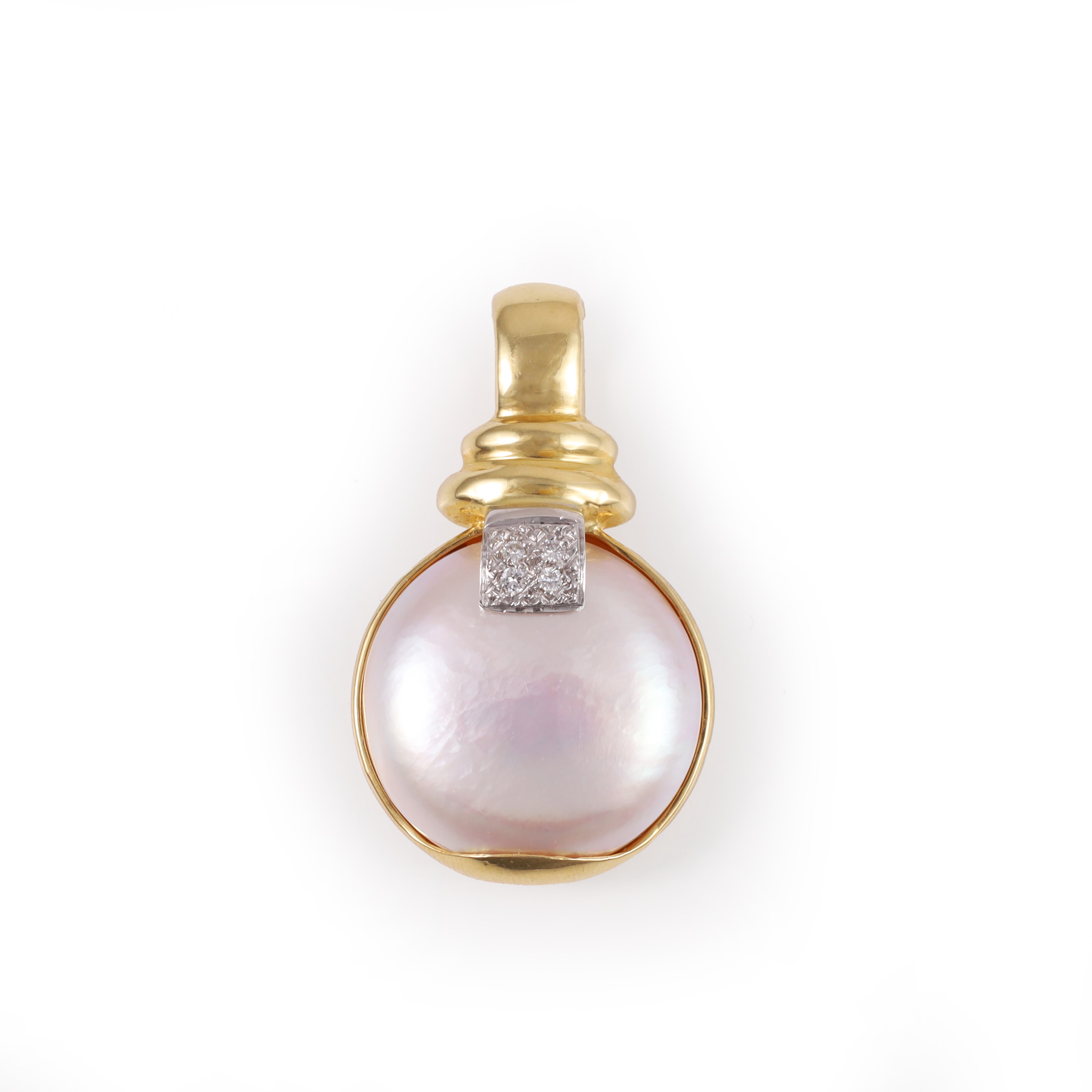 in oro giallo e bianco impreziositi da piccoli brillanti e madreperla a bottone, gr. 15,1.