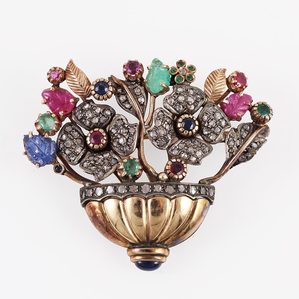 in oro basso e argento, modellata a forma di cesto fiorito con rubini, smeraldi zaffiri e diamanti taglio a rosa, gr. 23,5.