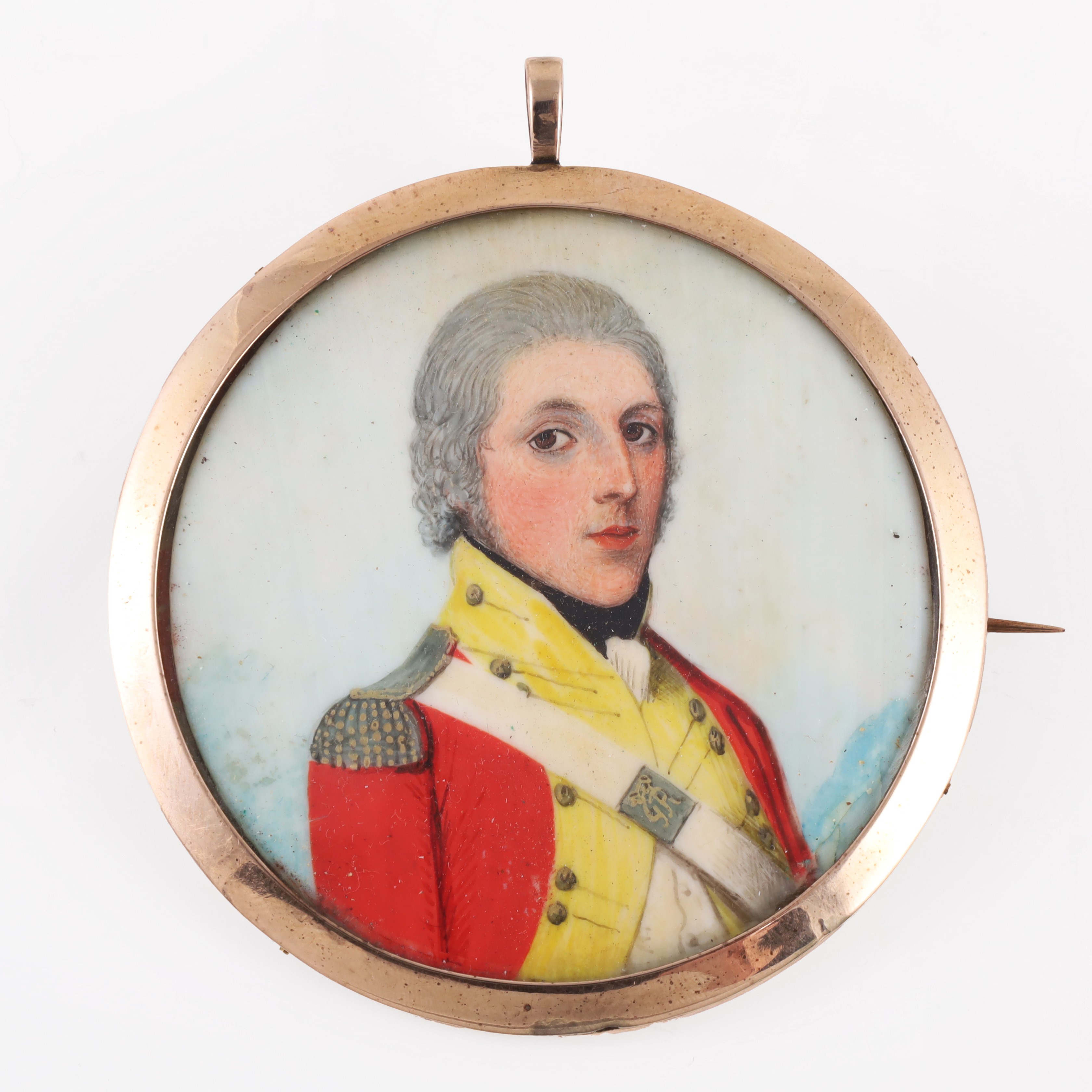 a forma circolare in oro, metallo e vetro, con miniatura raffigurante un soldato. Al verso reliquiario e iniziali incise "SB", gr. lordi 42.
