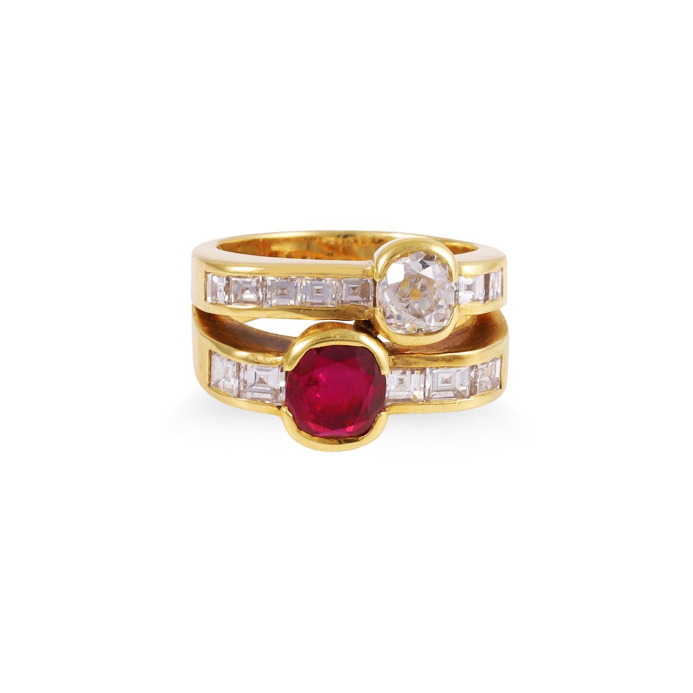 in oro giallo 18Kt a doppia rivière di diamanti taglio carré ornato al centro da un rubino e un diamante ovale, taglio antico europeo, gr. 10,5.