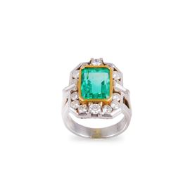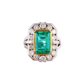 in oro bianco e giallo 18Kt con smeraldo rettangolare del peso di 5 ct ca., contornato da brillanti del peso complessivo di 1,10 ct ca. e affiancato da due diamanti taglio tapered, gr. 12,8.