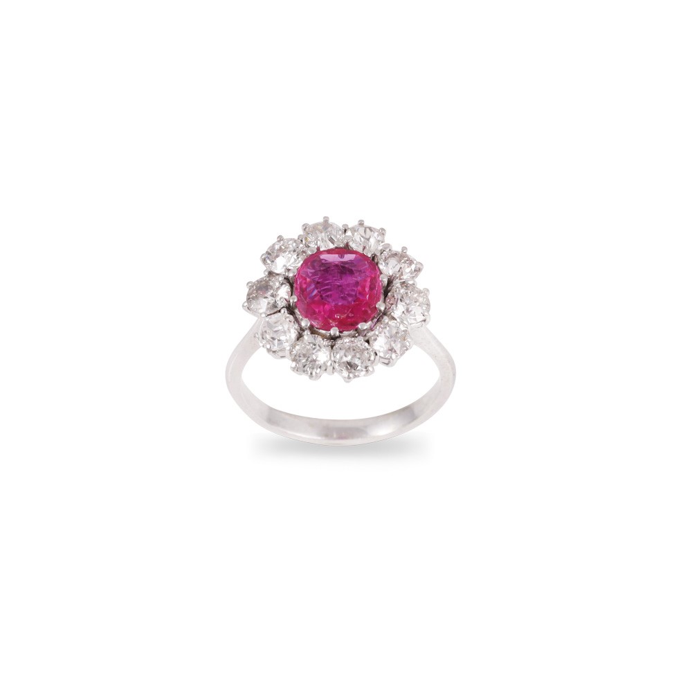 in oro bianco 18Kt con rubino ovale del peso di 1,20 ct ca., contornato da diamanti taglio antico europeo, gr. 5,4.