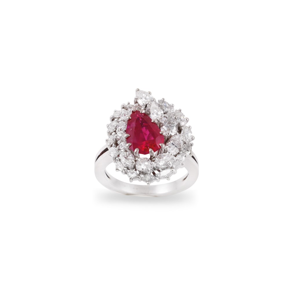 in oro bianco 18Kt con rubino a goccia del peso di 1,70 ct ca., contornato da un doppio giro di brillanti, diamanti taglio a goccia e navette posti in gradazione del peso complessivo di 1,50 ct ca., gr. 9,3.