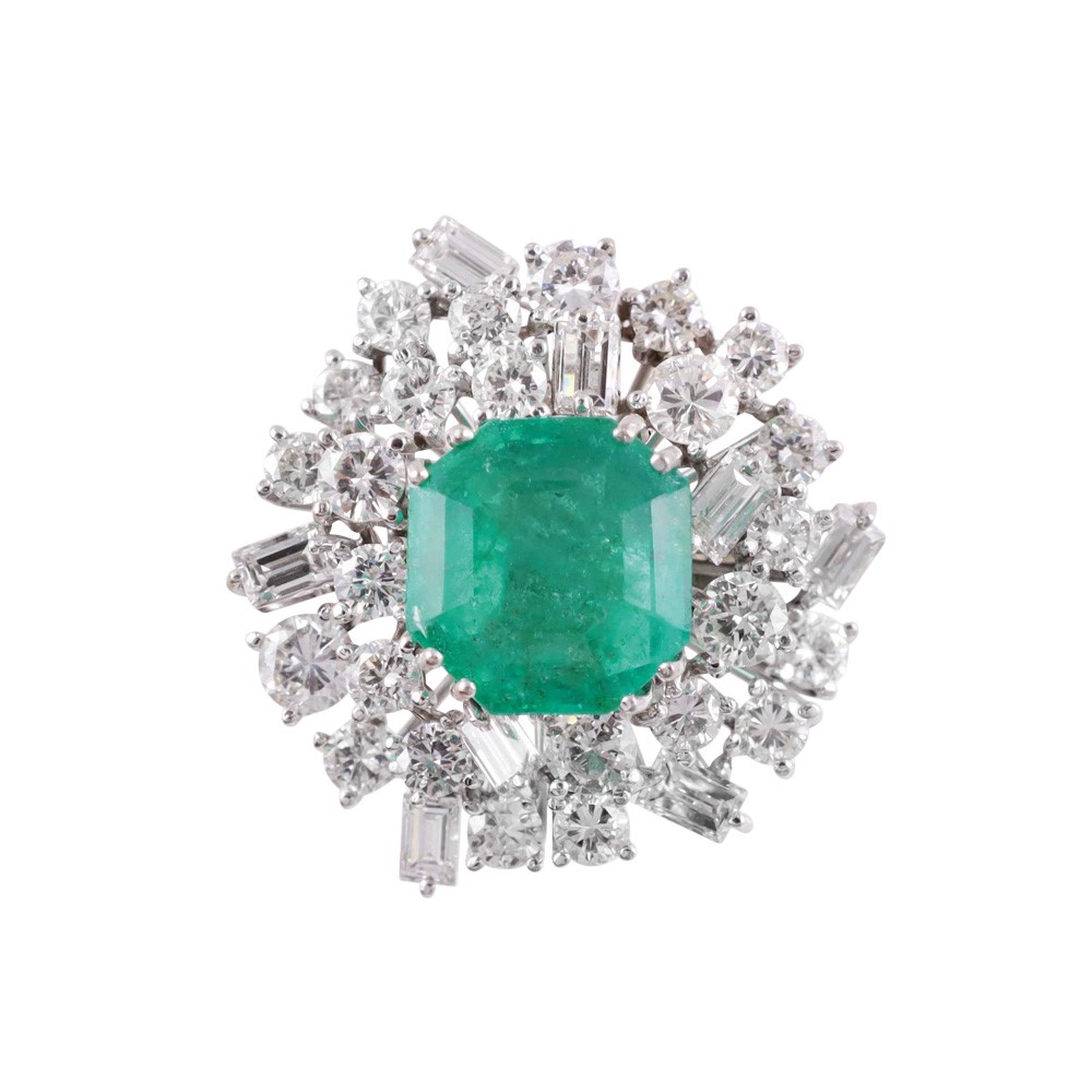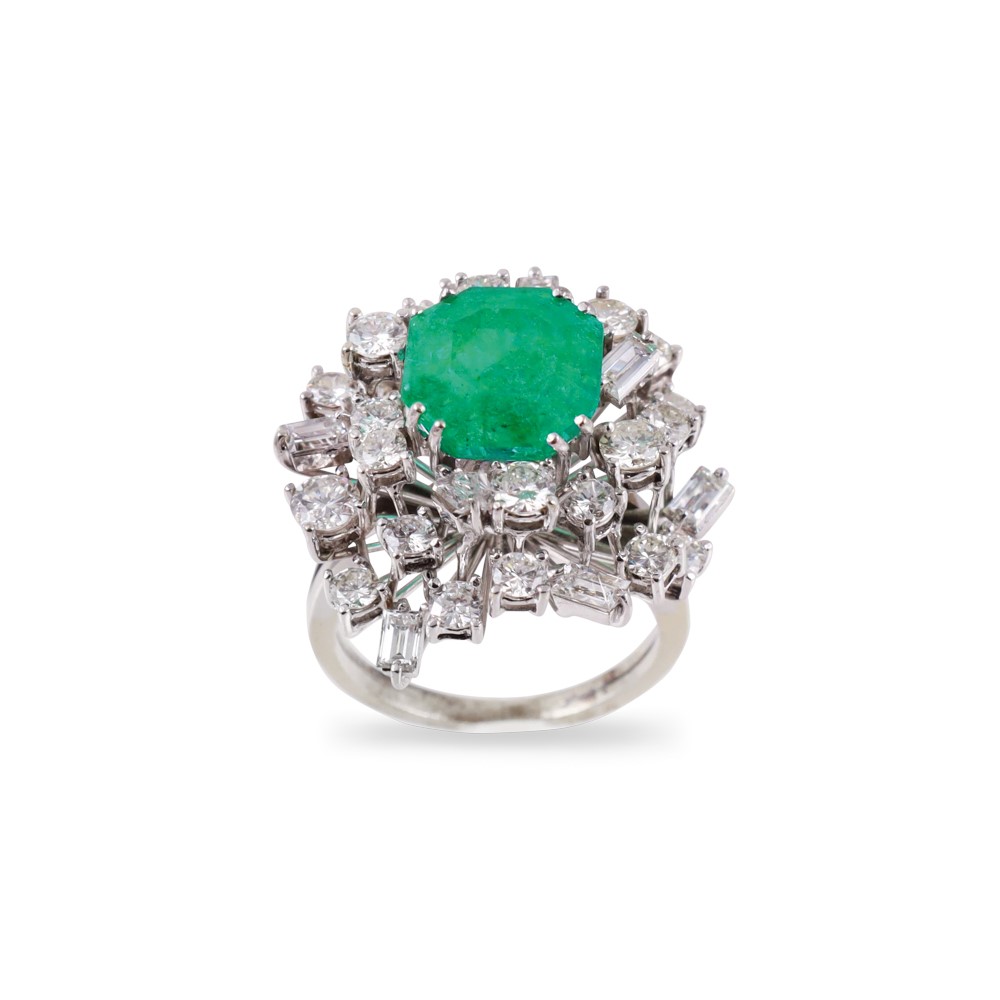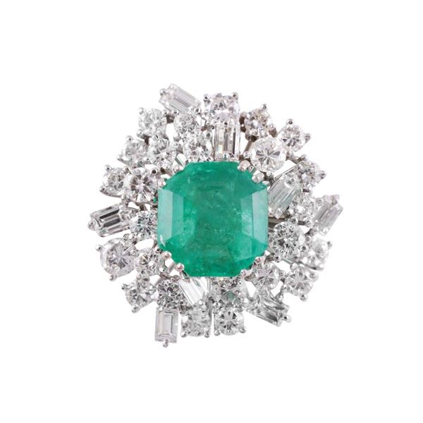 a cupola in oro bianco 18Kt con smeraldo ottagonale del peso di 4,50 ct ca., contornato da brillanti e diamanti baguette del peso complessivo 3 ct ca., gr. 10,2.