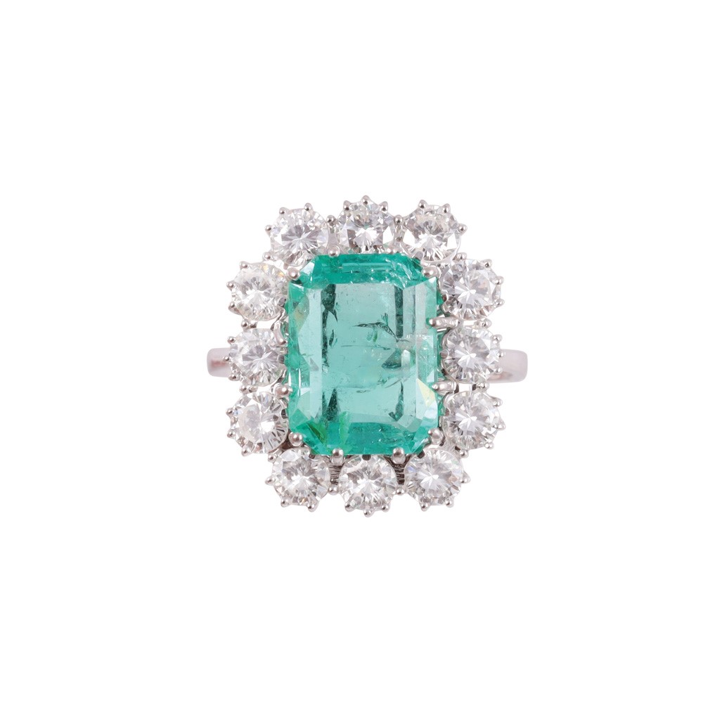in oro bianco 18Kt con smeraldo rettangolare contornato da brillanti, gr. 5,2.