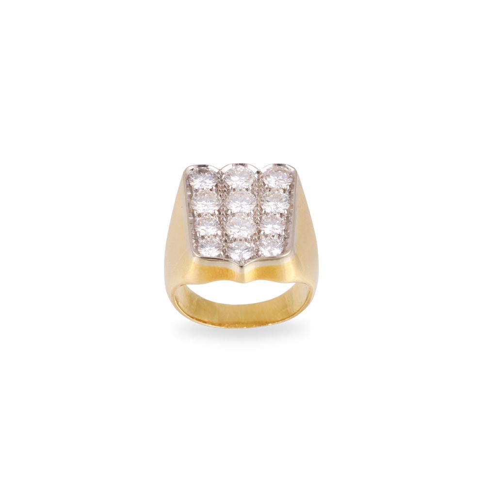 a fascia, in oro giallo e bianco 18Kt, con motivo anteriore a scudo in pavé di brillanti del peso complessivo di 1,40 ct ca., gr. 15,4.