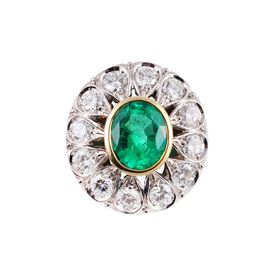 a rosone, in oro bianco e giallo 18Kt, impreziosito da uno smeraldo ovale del peso di 1,50 ct ca. contornato da un giro di brillanti del peso complessivo di 1,80 ct ca., gr. 11,2.