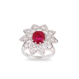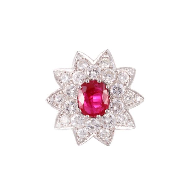 in oro bianco 18Kt, con motivo a stella, impreziosito da un rubino ovale del peso di 1,20 ct ca. e brillanti del peso complessivo di 1,70 ct ca., gr. 5,8.