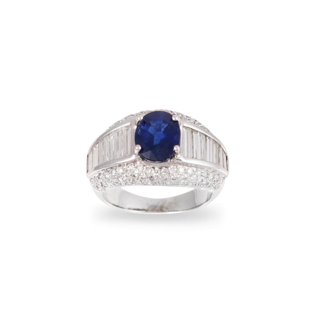 in oro bianco 18Kt, a fascia bombata con zaffiro ovale del peso di 1,70 ct ca., affiancato da diamanti taglio baguette posti in gradazione e impreziosito da brillanti in pavé, gr. 6,4.