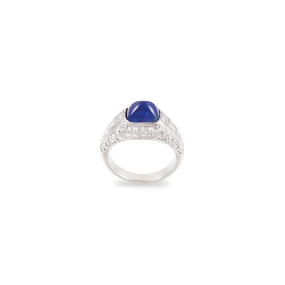 in platino e oro bianco 18Kt, culminante con uno zaffiro taglio sugar loaf, impreziosito da diamanti tondi e carré, gr. 5,2.
