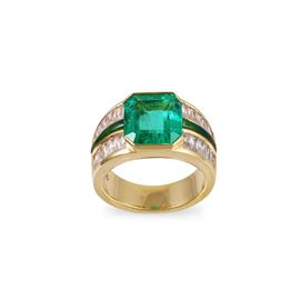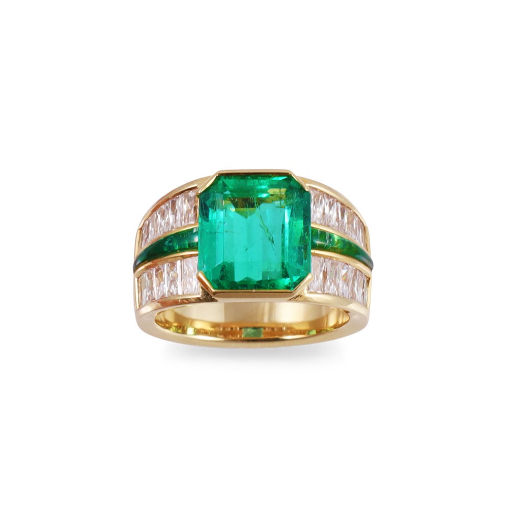 a fascia in oro giallo 18Kt con al centro smeraldo ottagonale del peso di 4,40 ct ca., affiancato da diamanti rettangolari del peso complessivo di 2,40 ct ca. e riporti in crisoprasio, gr. 12,9.