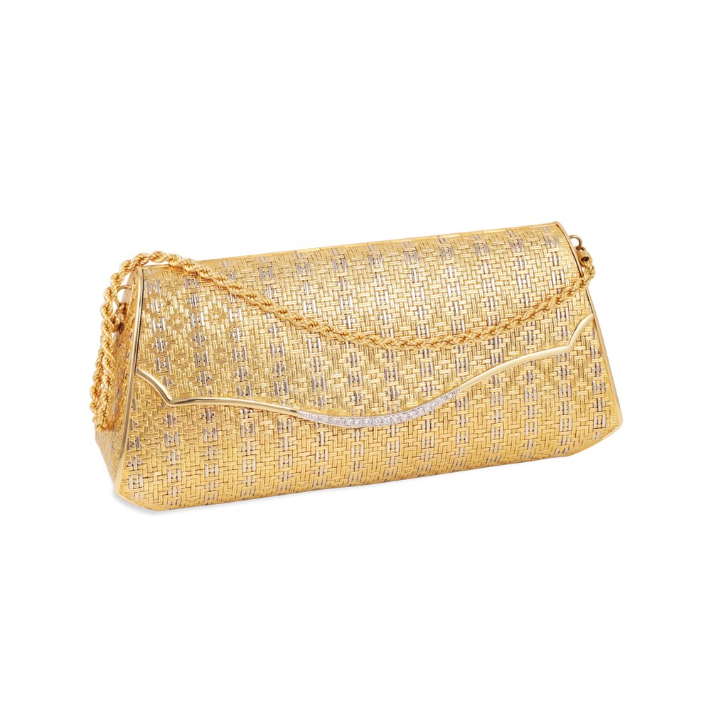 in oro giallo e bianco 18Kt con decoro geometrico ispirato alla paglia intrecciata, chiusura impreziosita da brillanti e manico a catena torchon, specchio all'interno, gr. netti 330.