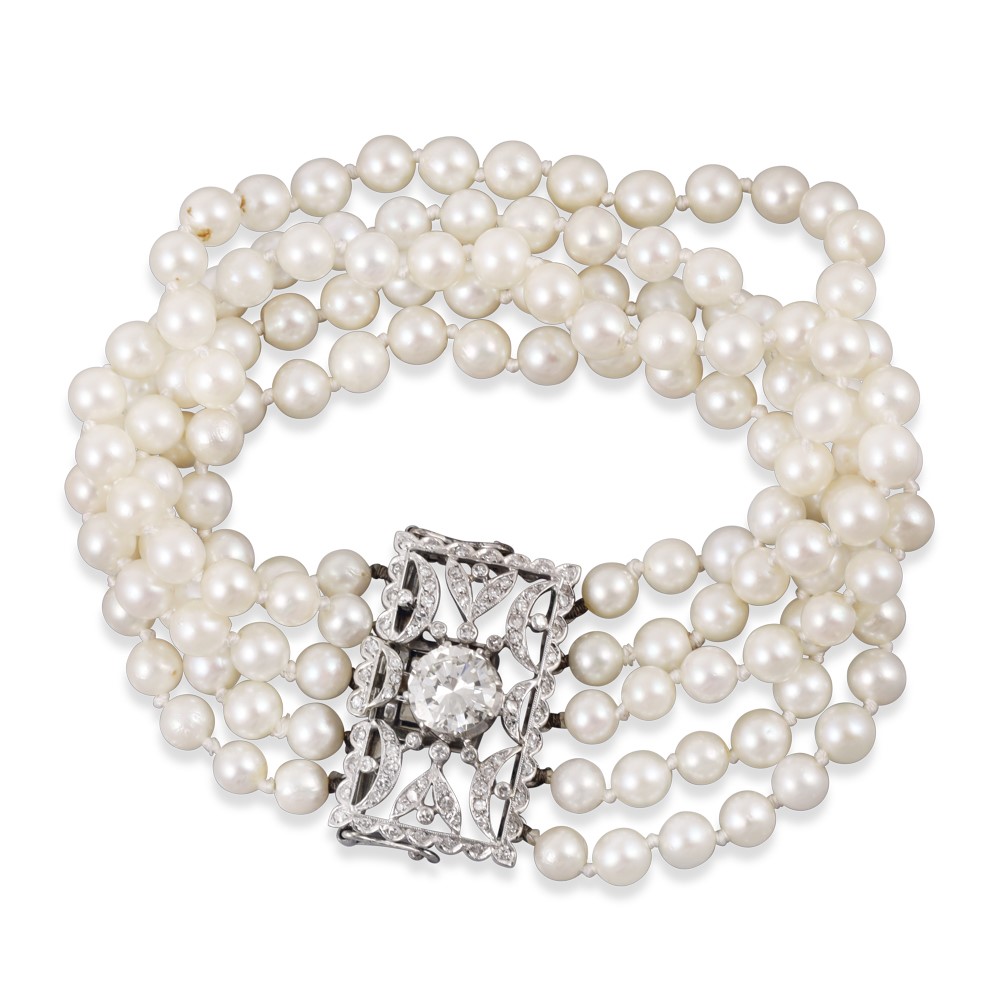 a cinque fili di perle coltivate con fermezza rettangolare traforata in oro bianco 18Kt e diamanti, centrata da un brillante del peso di 1,50 ct ca., gr. complessivi 37.