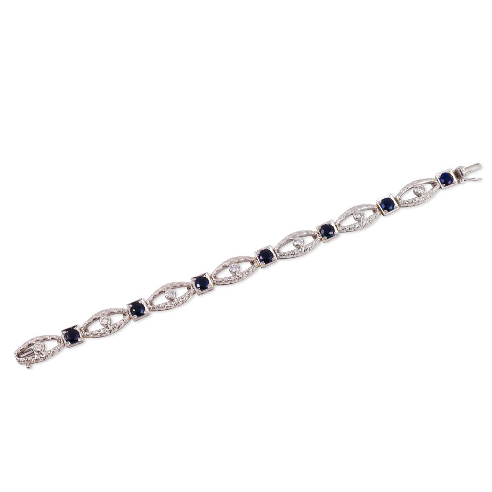 in oro bianco 18Kt, composto da ovali aperti incisi, ciascuno centrato da un brillante, alternati a motivi quadrati ornati da zaffiri, gr. 25,3.