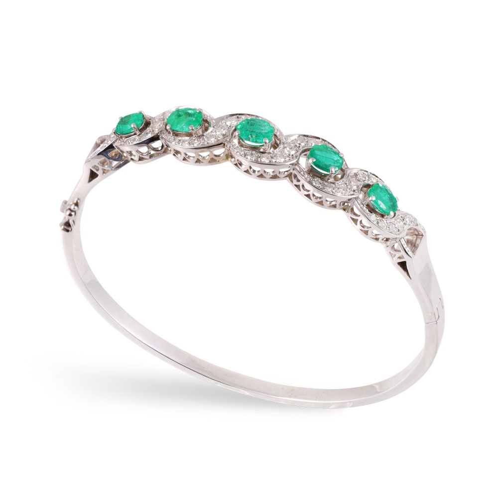 rigido, in oro bianco 18Kt, ornato anteriormente da smeraldi ovali contornati da diamanti, gr. 25,1.