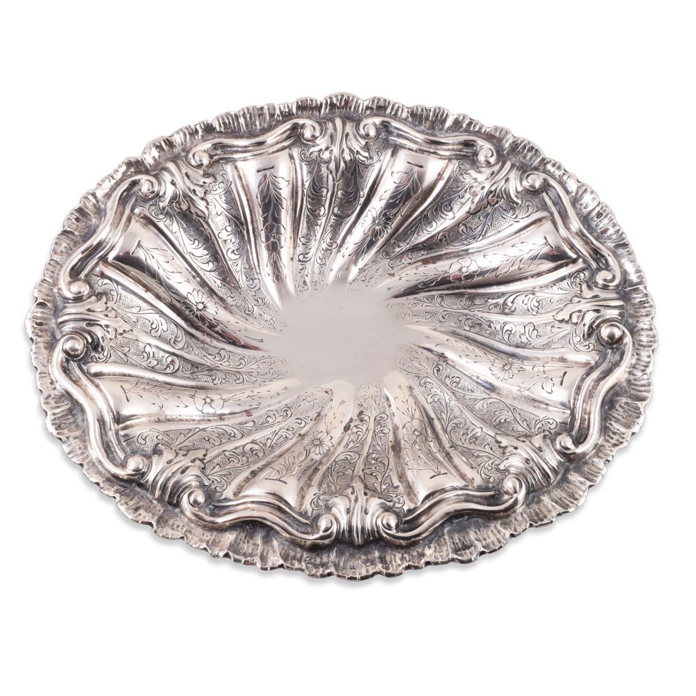 in argento 800/1000 a corpo ovale baccellato inciso a motivi vegetali, sorretto da piedini, gr. 420 ca.