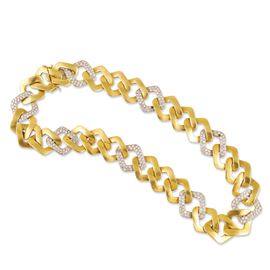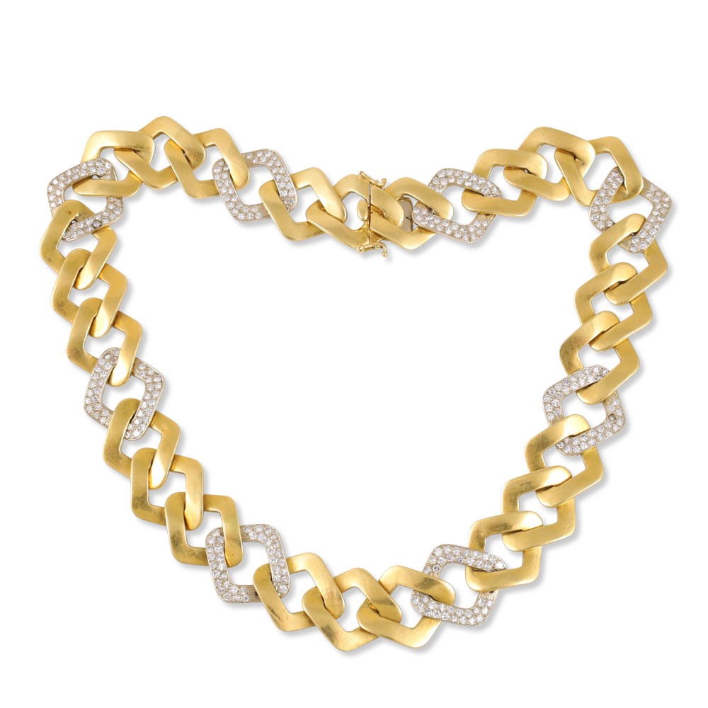 a maglie romboidali in oro giallo e in oro bianco 18Kt con pavé di diamanti (due mancanti), gr. 133,2.