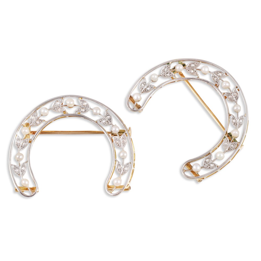 in oro giallo 18Kt e platino, a semiluna con motivo a ghirlanda in diamanti taglio a rosa e piccole perle, gr. complessivi 11,4.