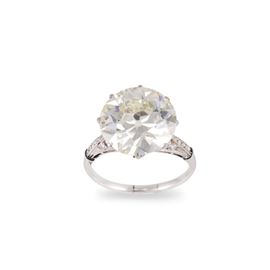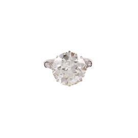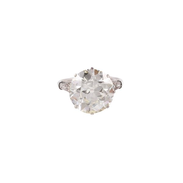 taglio antico europeo del peso di 9,60 ct, montato su anello in platino impreziosito da piccoli diamanti, gr. 7.