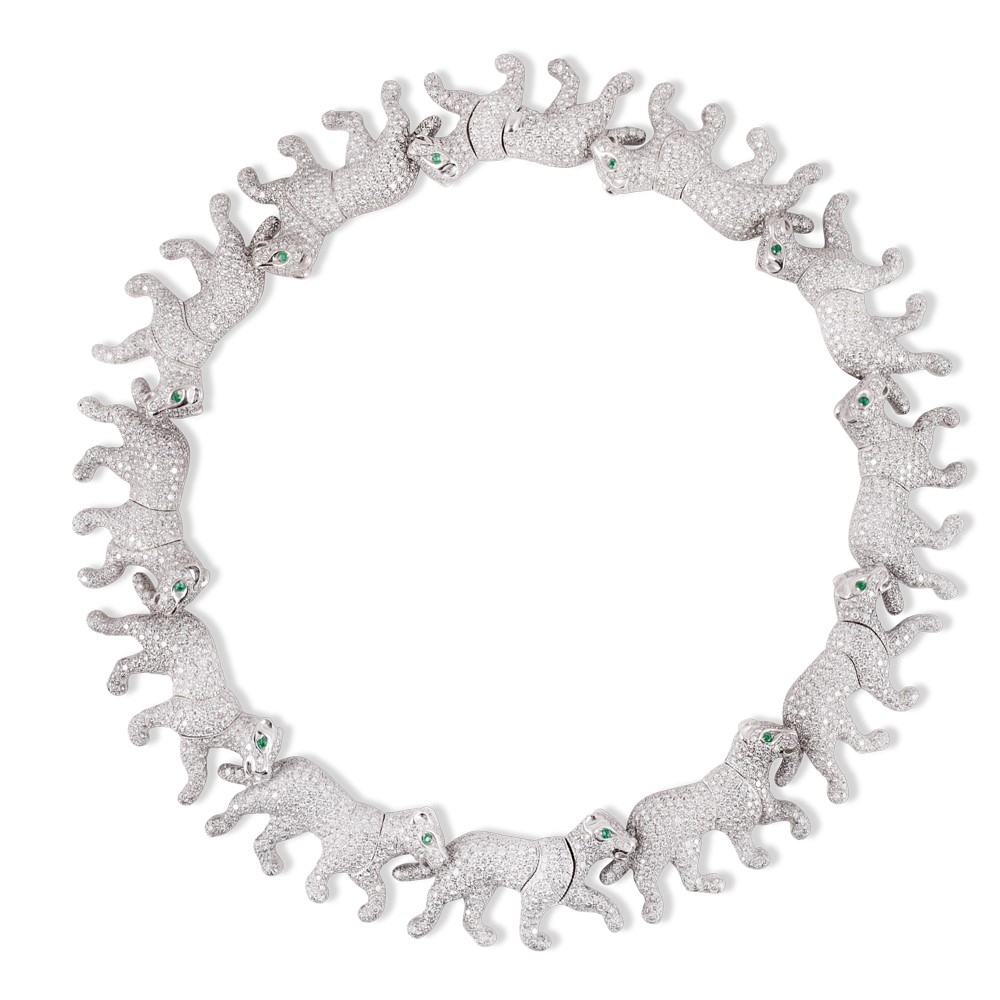 in platino, composto da pantere in pavé di brillanti del peso complessivo di 80 ct ca. e smeraldi per occhi, gr. 354,2.
