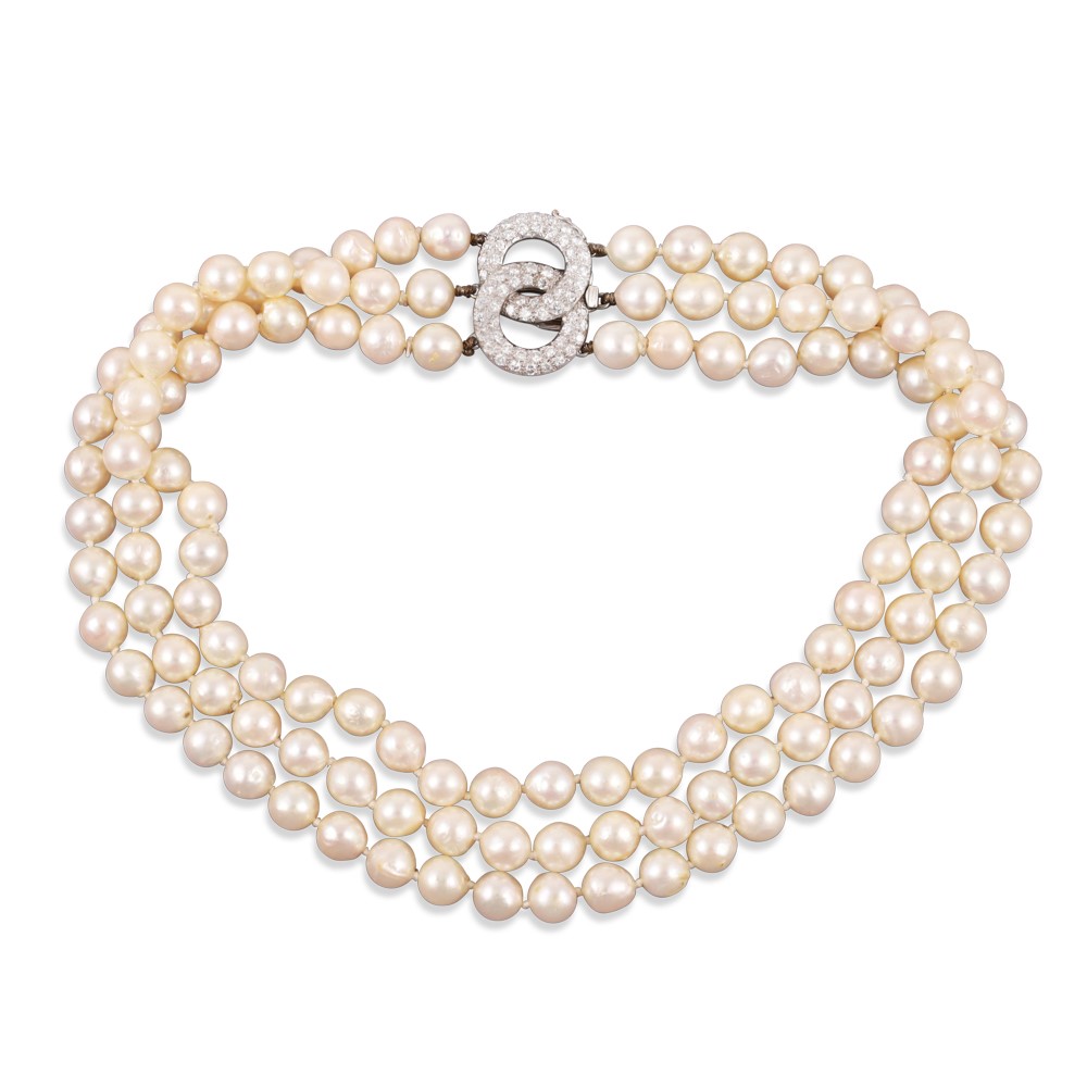 a tre fili di perle coltivate con fermezza in oro bianco 18Kt e platino a due cerchi in pavé di brillanti del peso complessivo di 3 ct ca.