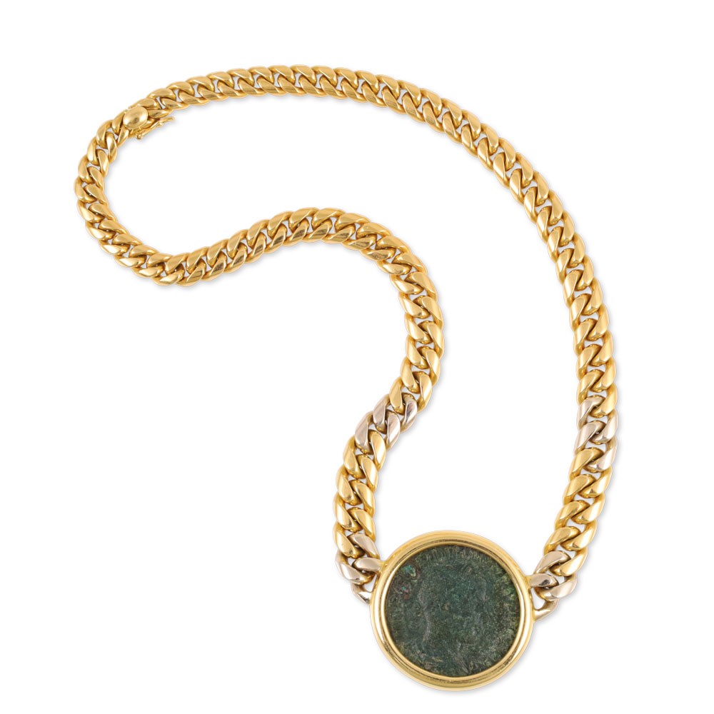 in oro giallo e bianco 18Kt a maglia groumette con riproduzione di moneta in bronzo, gr. lordi 116,6.