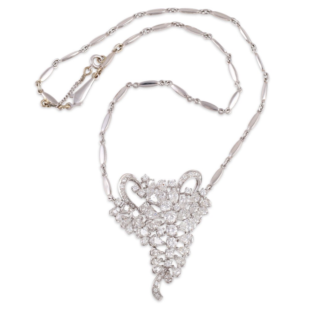 in oro bianco 18Kt con pendente d'ispirazione vegetale interamente impreziosito da brillanti e diamanti a goccia del peso complessivo di 4,50 ct ca., gr. complessivi 28.