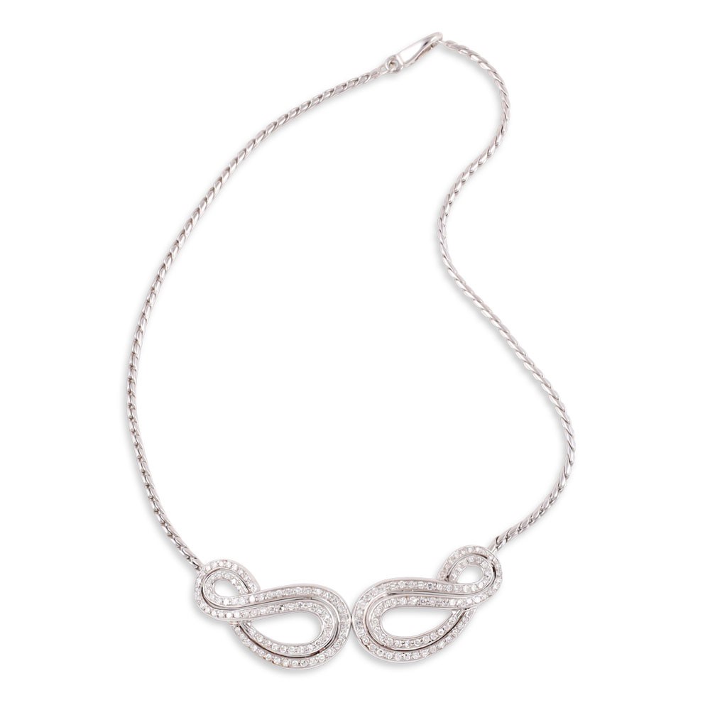 in oro bianco 18Kt con motivo anteriore a volute in diamanti, gr. 28,8.