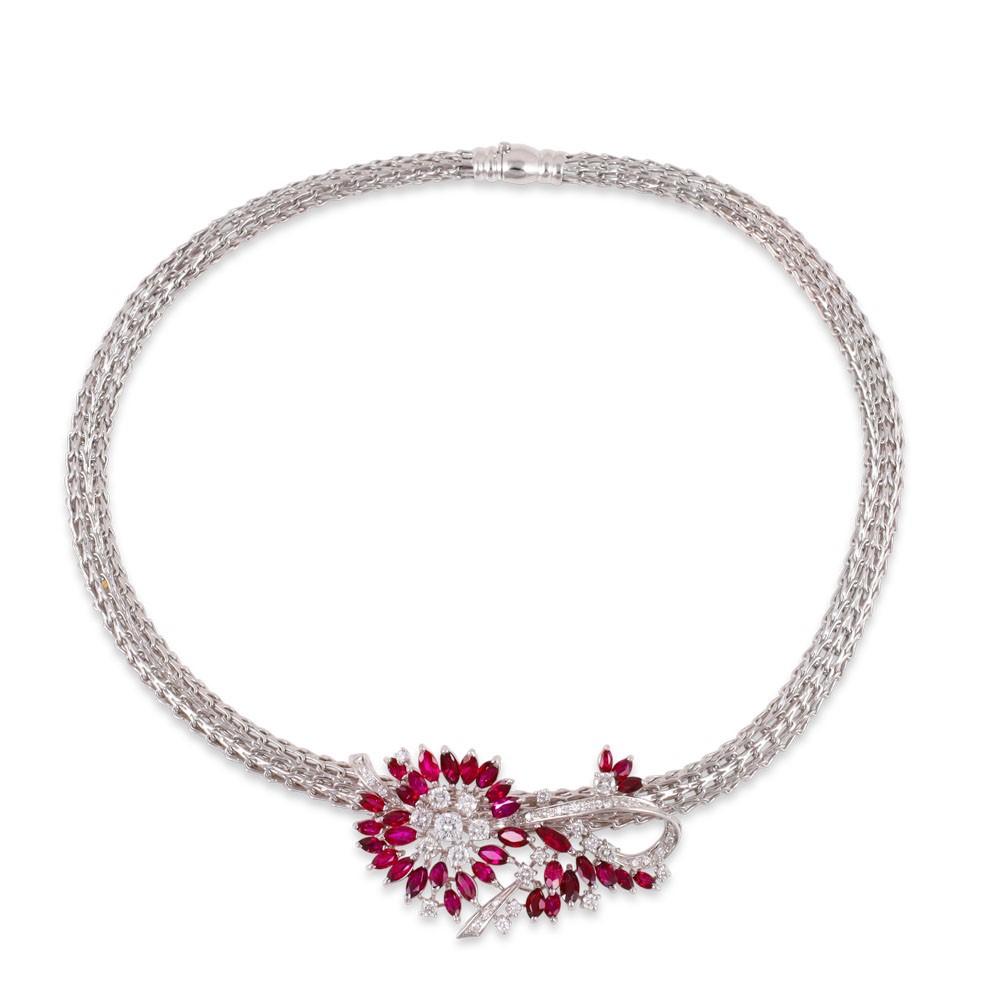 in oro bianco 18Kt a maglia tubolare con motivo floreale posto al centro ornato da brillanti e rubini navette, gr. 53,1.