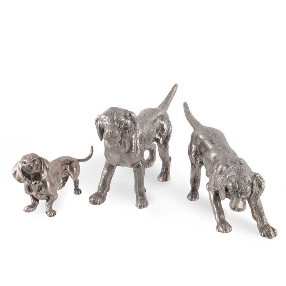 composto da un bassotto in argento 800/1000 gr. 123 ca. e due cani da caccia in metallo.