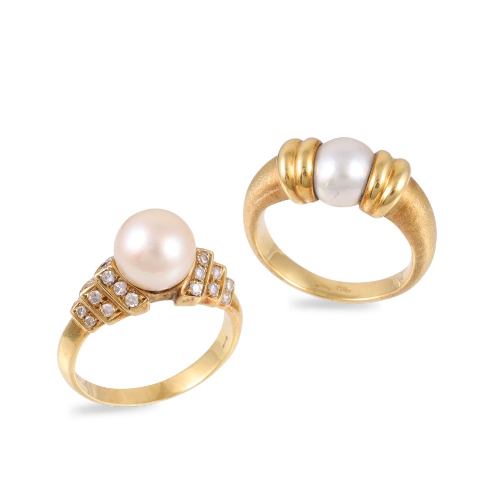 composto da due anelli in oro giallo 18Kt con perle coltivate, di cui uno impreziosito da diamanti, gr. complessivi 14,8.