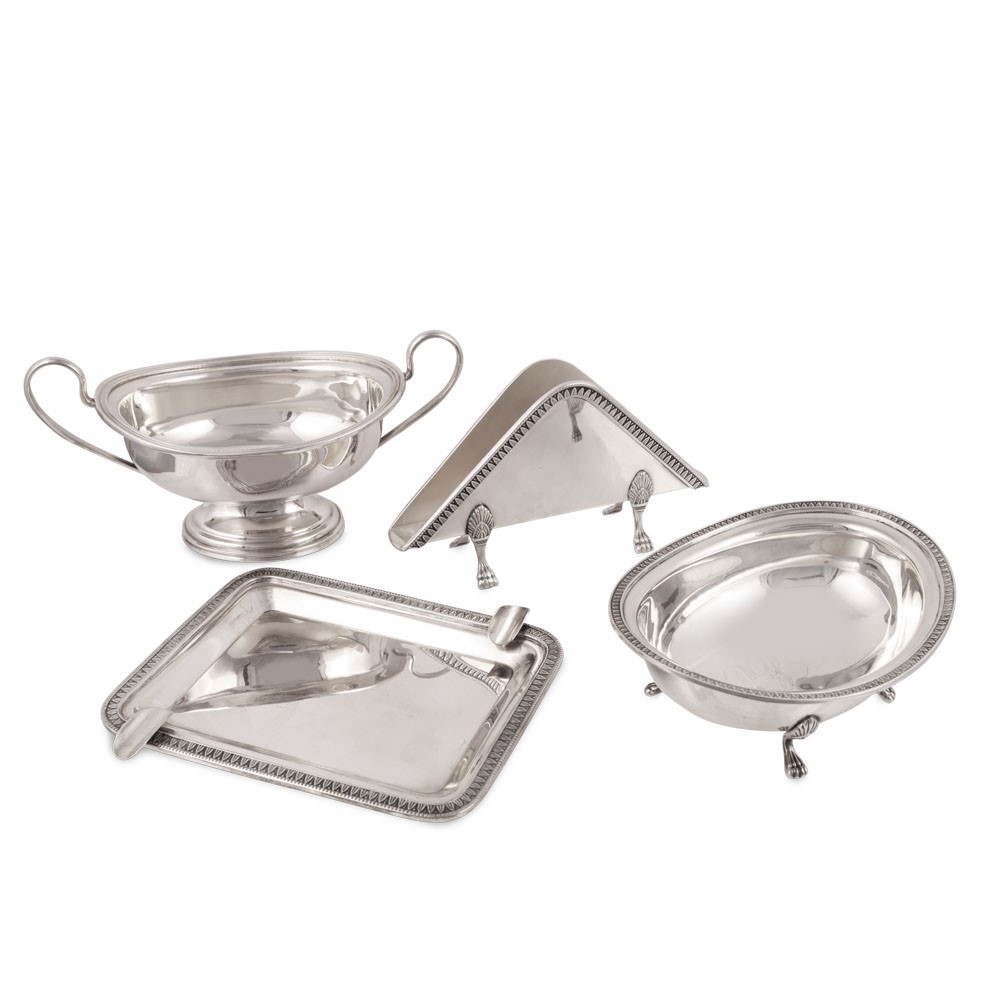 in argento 800/1000 composto da due ciotole ovali di cui una biansata marcata F.C. (Cacchione F.lli - Milano), un posacenere rettangolare e un porta tovaglioli con decori a palmette, gr. complessivi 460 ca.