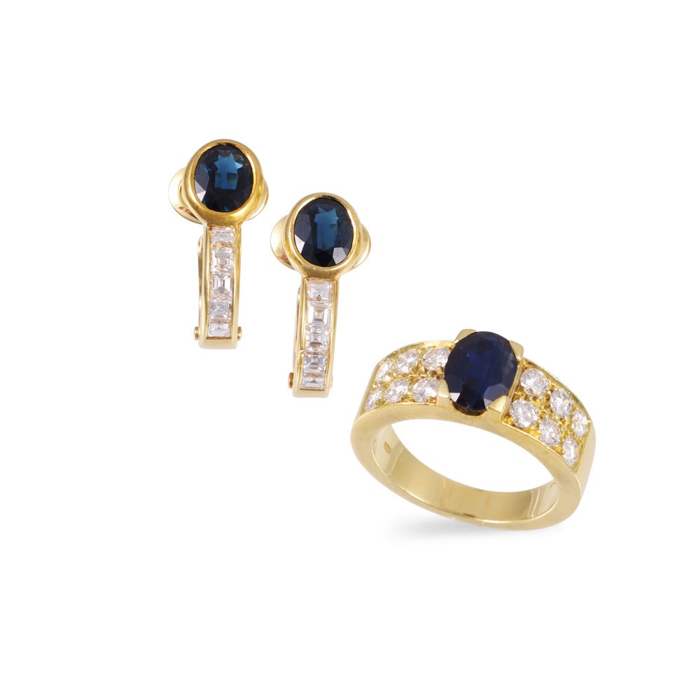 composto da anello a fascia e orecchini a clip ornati da zaffiri e diamanti, realizzati in oro giallo 18Kt, gr. complessivi 14,4.