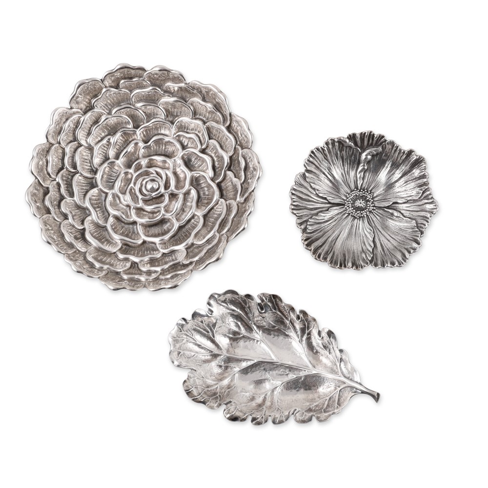 in argento 800/1000, composto da tre ciotole di cui due a forma di fiore e una a foglia firmate Gianmaria Buccellati e una scultura a guisa di papero, lavorata a pelo, gr. complessivi 250 ca.