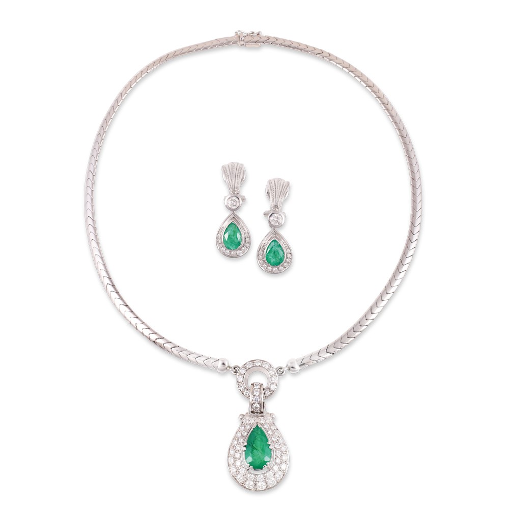 in oro bianco 18Kt, composto da girocollo con pendente e orecchini a clip impreziositi da smeraldi a goccia e brillanti, gr. complessivi 55,9.