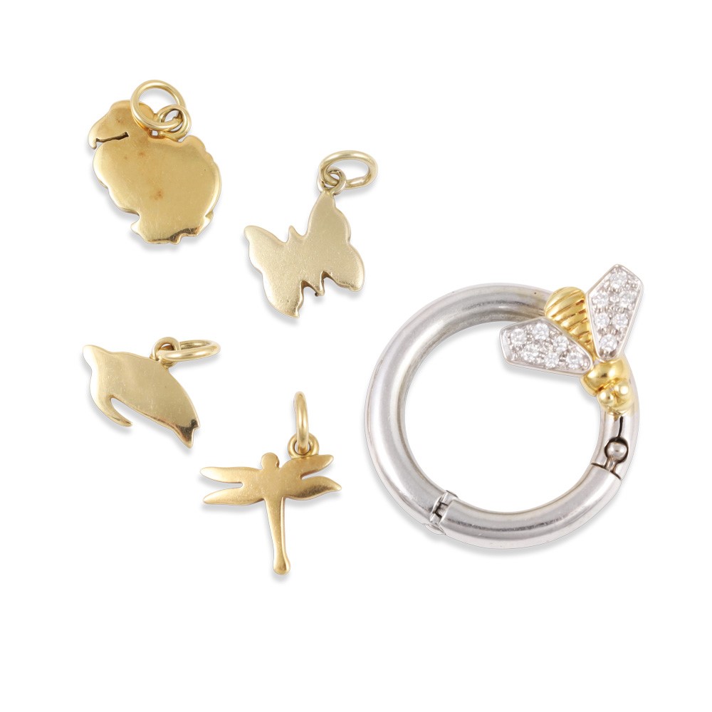 portachiavi ad anello con ape in oro giallo e bianco 18Kt con brillanti firmato Pomellato e quattro pendenti animalier tra cui tre "DoDo" Pomellato, gr. complessivi 18,2.